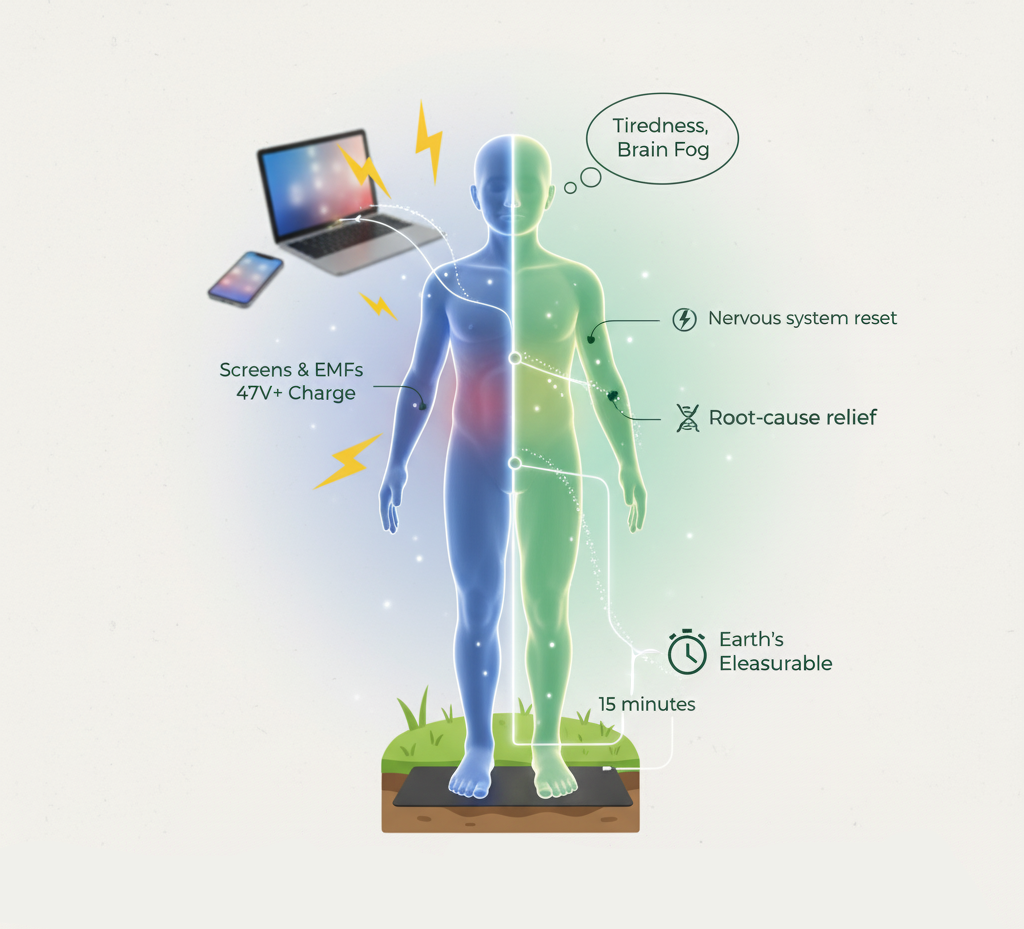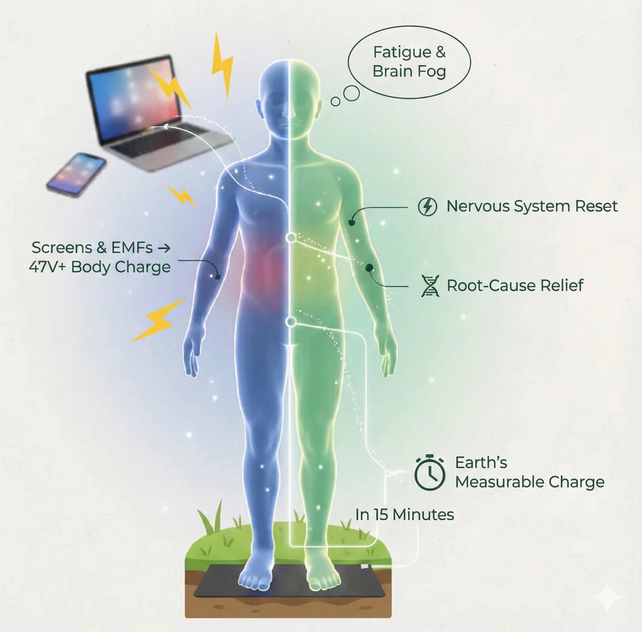 Even 8 hours in bed can feel like 3 when your body holds a 47V positive charge from screens and EMFs.