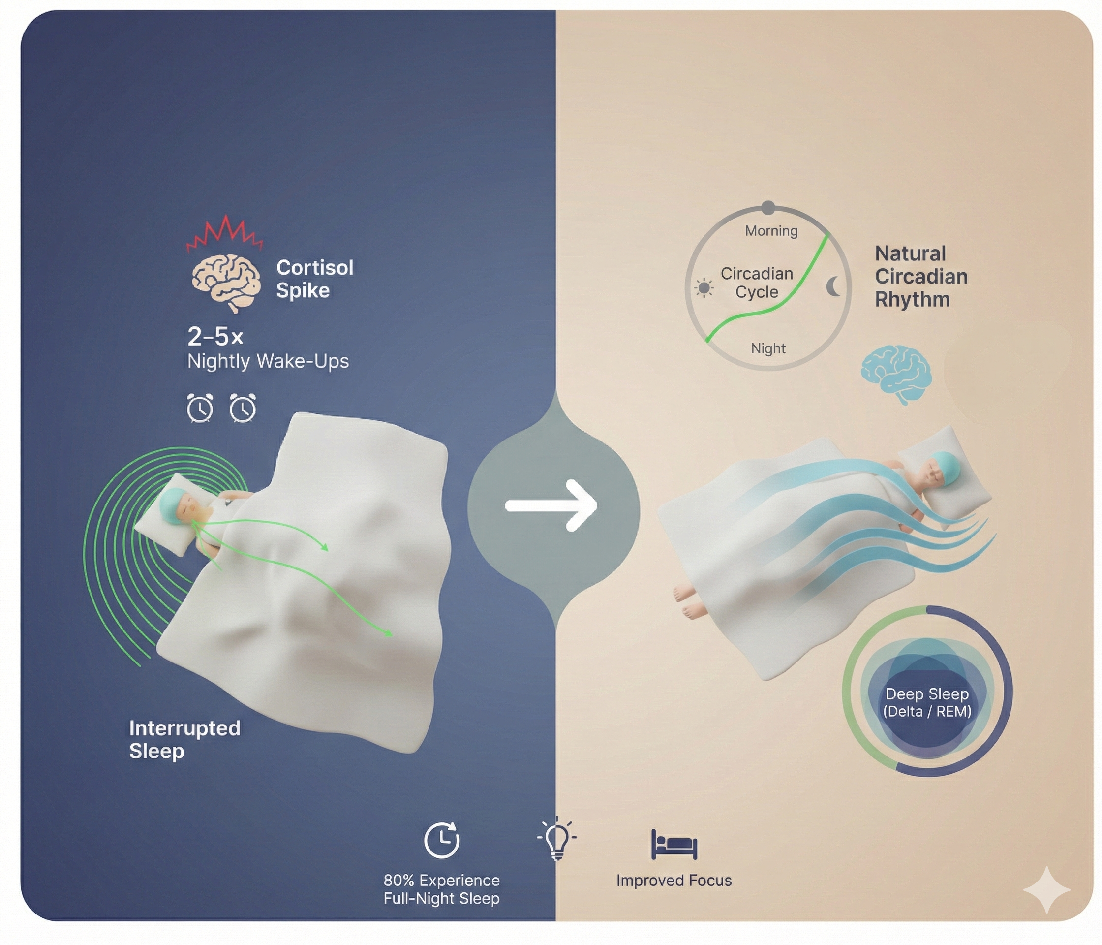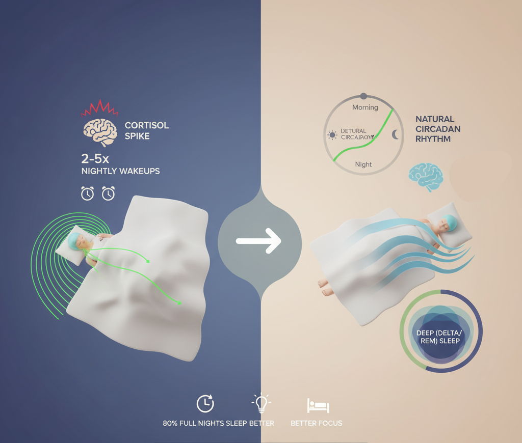 Waking up 2–5 times a night? That’s cortisol — your stress hormone — spiking when your body never fully relaxes. Grounding restores your body’s natural circadian rhythm and calms cortisol production, so you can stay asleep through deep (Delta/REM) phases.